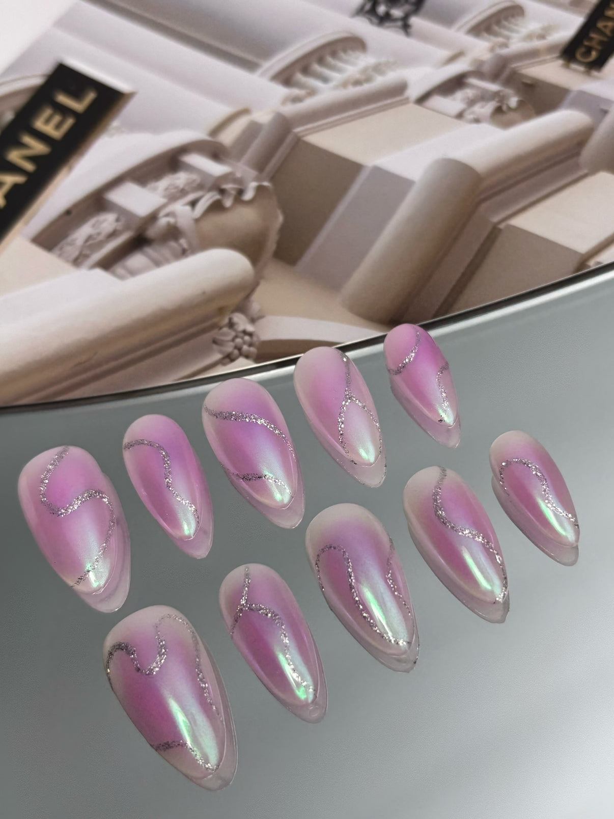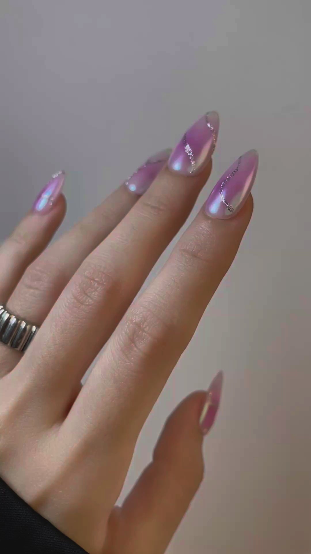 ふんわりとしたピンクのベースが指先に自然な血色感を与えつつ、極細のオーロララインが光を受けて繊細に輝きます。