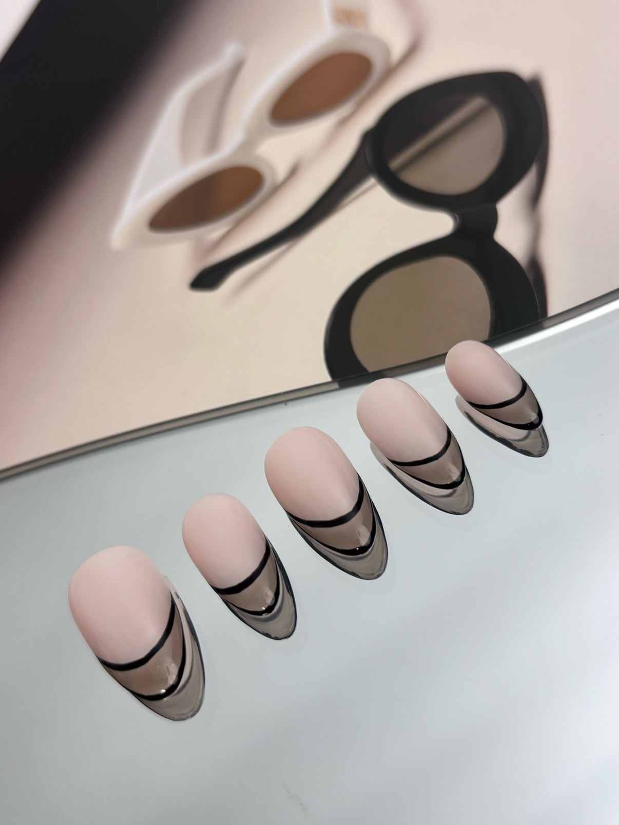 ヌーディーベースにやわらかなフレンチデザインと繊細なブラックラインを組み合わせた、アーモンド型のハンドメイドネイルチップ。優しげなベージュトーンに、細く引かれたブラックのラインがアクセントとして効き、甘さの中にほんのり大人のモード感を添えます。指先をすっきりと見せるアーモンドシルエットと相まって、上品かつスタイリッシュな印象に。