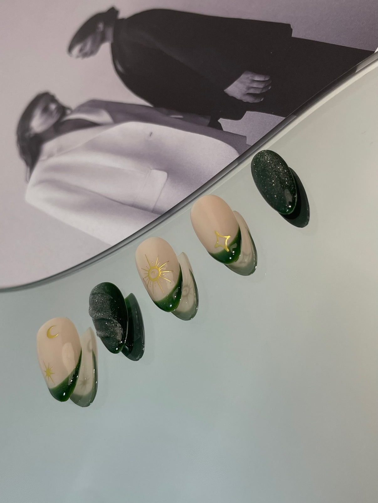 奥行きのある輝きが魅力のキャッツアイデザインに、立体感とヴィンテージ風のニュアンスを加えた、ショートアーモンド型ハンドメイドネイルチップ。光の角度で表情を変えるマグネットラインが指先に深みと神秘的な印象を与え、クラシカルな雰囲気を演出します。